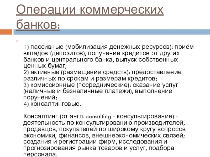 1) пассивные (мобилизация денежных ресурсов): приём вкладов (депозитов), получение