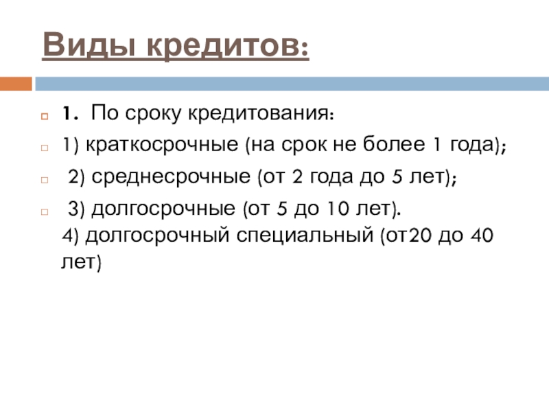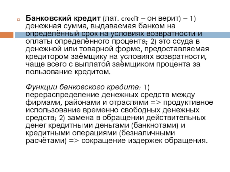 Слайд 13Банковский кредит (лат. credit – он верит) – 1) денежная сумма, выдаваемая