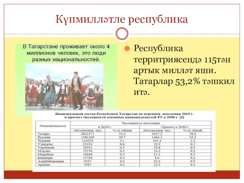 Күпмилләтле республикаРеспублика территриясендә 115тән артык милләт яши. Татарлар 53,2% тәшкил итә.