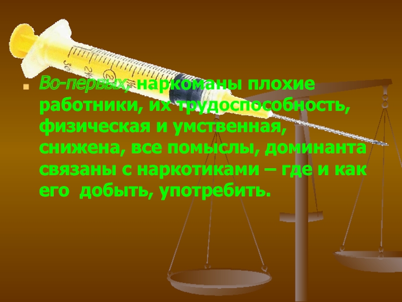 Слайд 9Во-первых, наркоманы плохие работники, их трудоспособность, физическая и умственная, снижена, все
