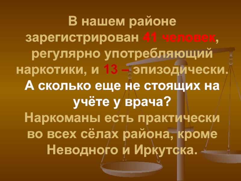 Слайд 4В нашем районе зарегистрирован 41 человек, регулярно употребляющий наркотики, и 13