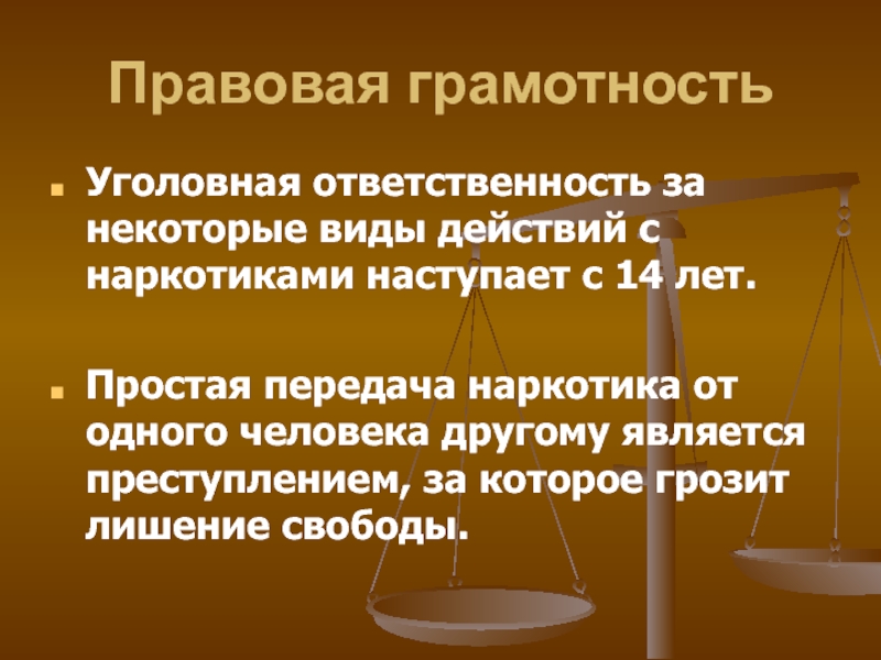 Слайд 27Уголовная ответственность за некоторые виды действий с наркотиками наступает с 14