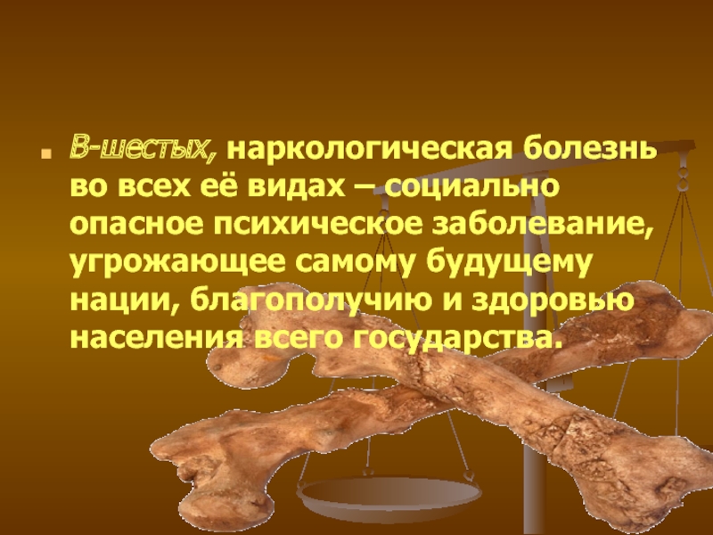 Слайд 14В-шестых, наркологическая болезнь во всех её видах – социально опасное психическое