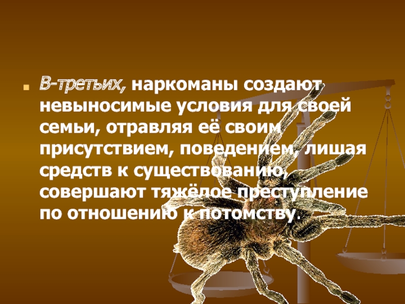 Слайд 11В-третьих, наркоманы создают невыносимые условия для своей семьи, отравляя её своим