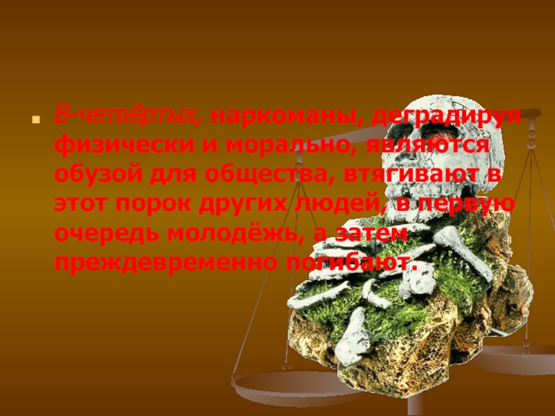 Слайд 12В-четвёртых, наркоманы, деградируя физически и морально, являются обузой для общества, втягивают