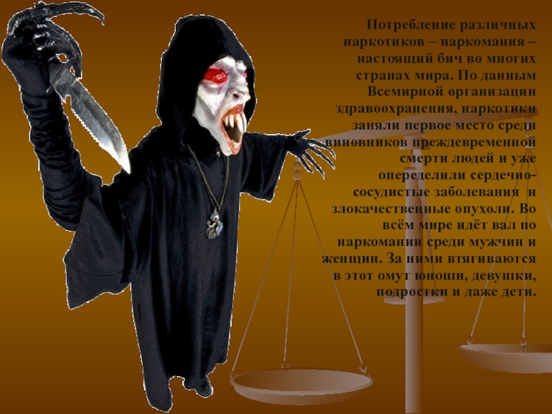 мира. По данным Всемирной организации здравоохранения, наркотики заняли первое место среди виновников преждевременной смерти людей и уже опеределили сердечно-сосудистые заболевания и злокачественные опухоли. Во всём мире идёт вал по наркомании среди мужчин и женщин. За ними втягиваются в этот омут юноши, девушки, подростки и даже дети.