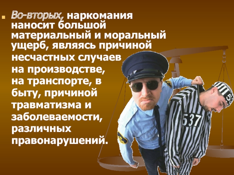 Слайд 10Во-вторых, наркомания наносит большой материальный и моральный ущерб, являясь причиной