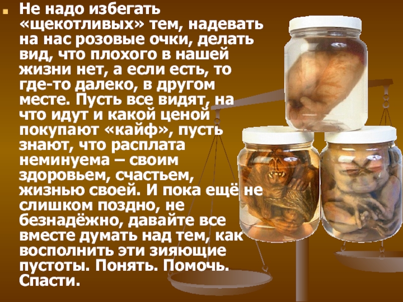 вид, что плохого в нашей жизни нет, а если есть, то где-то далеко, в другом месте. Пусть все видят, на что идут и какой ценой покупают «кайф», пусть знают, что расплата неминуема – своим здоровьем, счастьем, жизнью своей. И пока ещё не слишком поздно, не безнадёжно, давайте все вместе думать над тем, как восполнить эти зияющие пустоты. Понять. Помочь. Спасти.