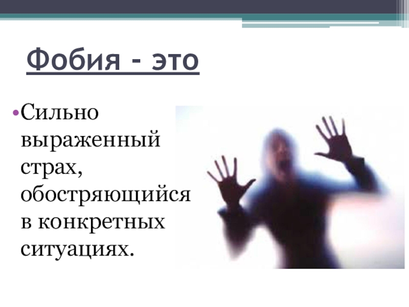 Фобия - этоСильно выраженный страх, обостряющийся в конкретных ситуациях.