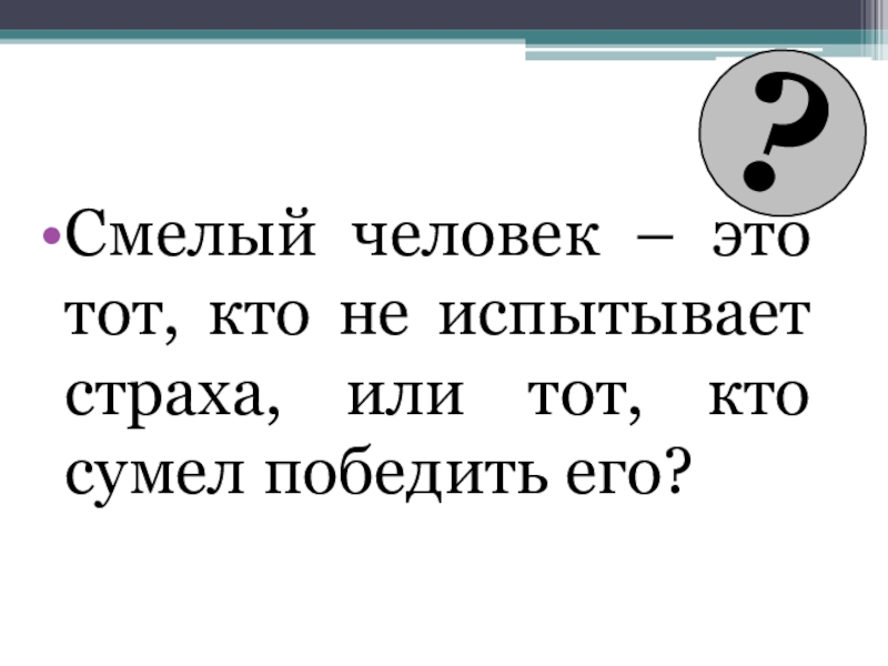 Слайд 10Смелый человек – это тот, кто не испытывает страха, или тот,