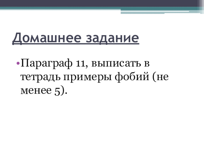 Домашнее заданиеПараграф 11, выписать в тетрадь примеры фобий (не менее 5).