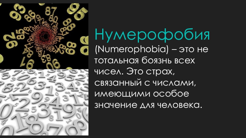 Слайд 6Нумерофобия (Numerophobia) – это не тотальная боязнь всех чисел. Это страх,