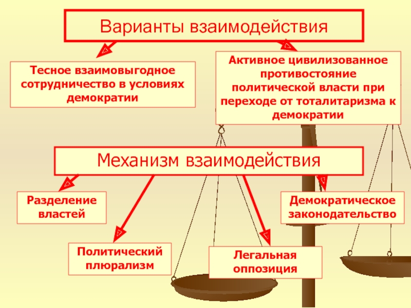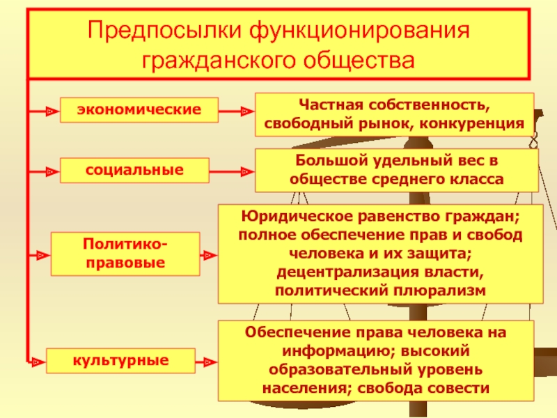 Юридическое равенство граждан; полное обеспечение прав и свобод человека и их защита; децентрализация власти, политический плюрализм