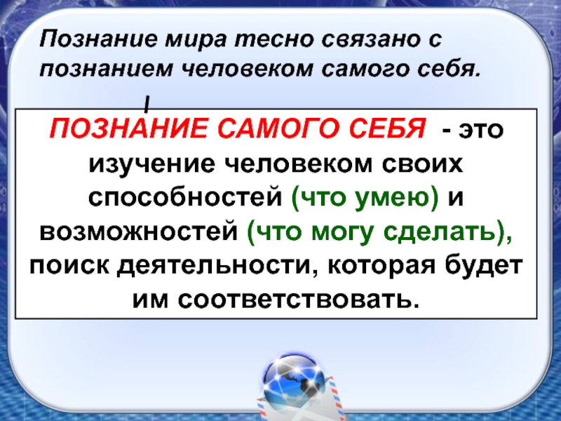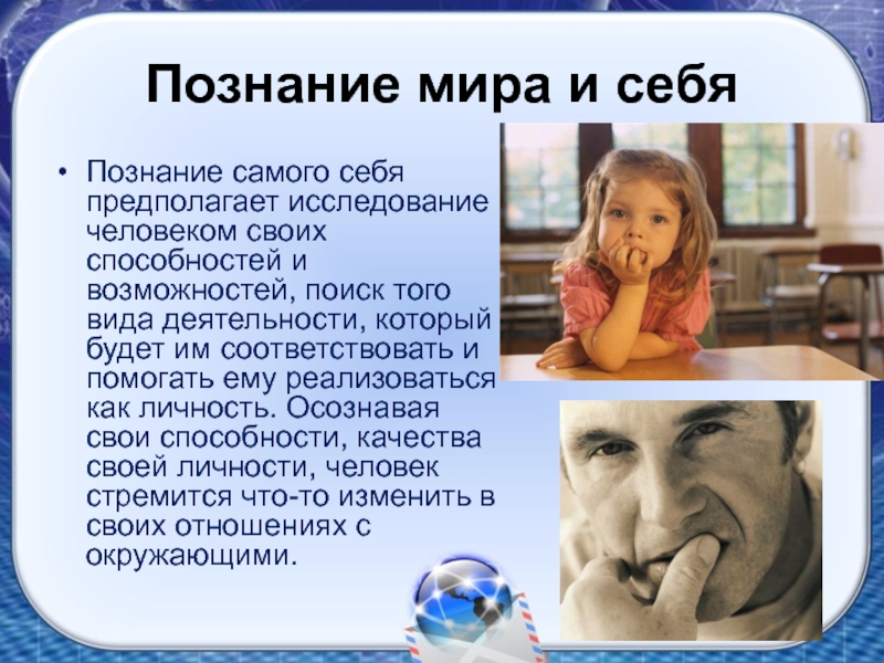 Слайд 16Познание мира тесно связано с познанием человеком самого себя.