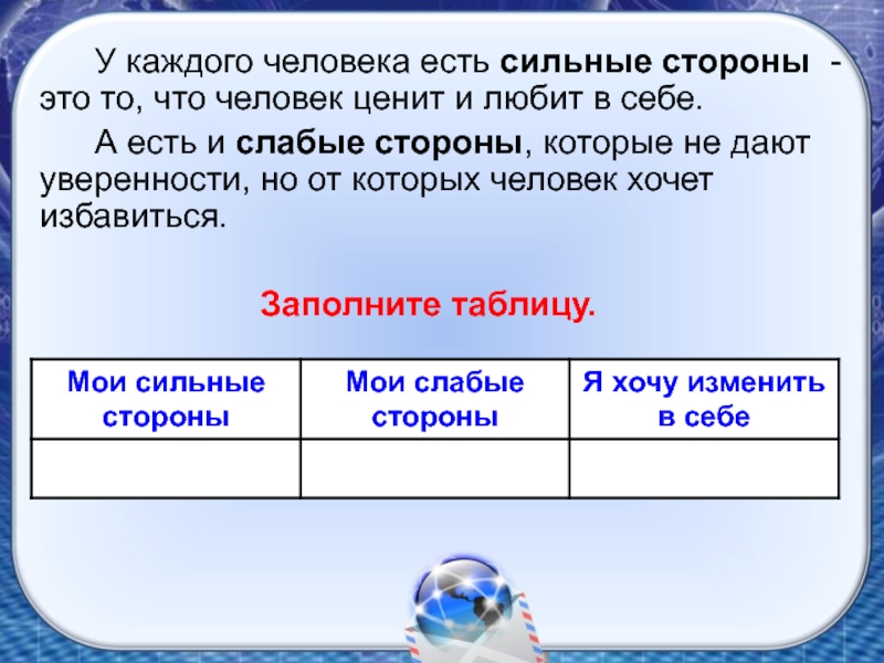 А есть и слабые стороны, которые не дают уверенности, но от которых человек хочет избавиться.