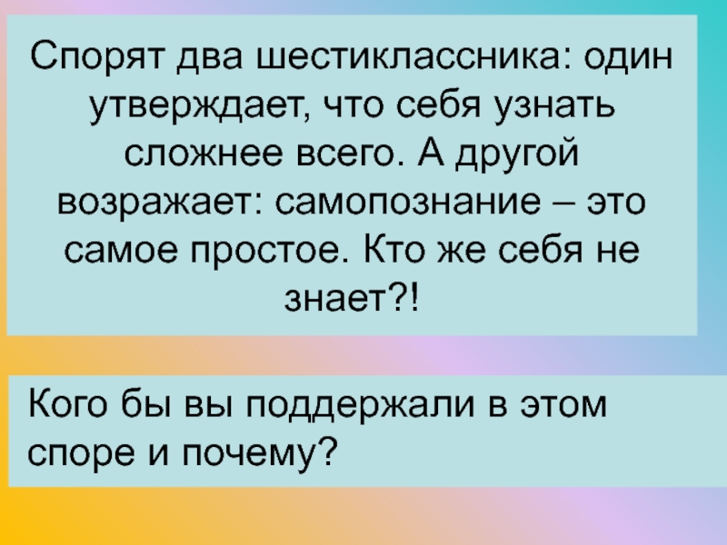 Слайд 19Спорят два шестиклассника: один утверждает, что себя узнать сложнее всего. А