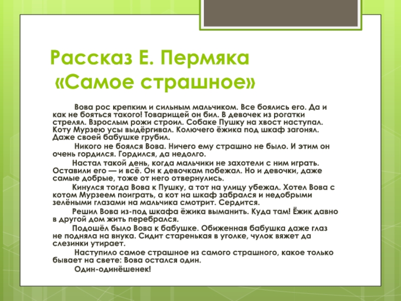рос крепким и сильным мальчиком. Все боялись его. Да и как не бояться такого! Товарищей он бил. В девочек из рогатки стрелял. Взрослым рожи строил. Собаке Пушку на хвост наступал. Коту Мурзею усы выдёргивал. Колючего ёжика под шкаф загонял. Даже своей бабушке грубил.