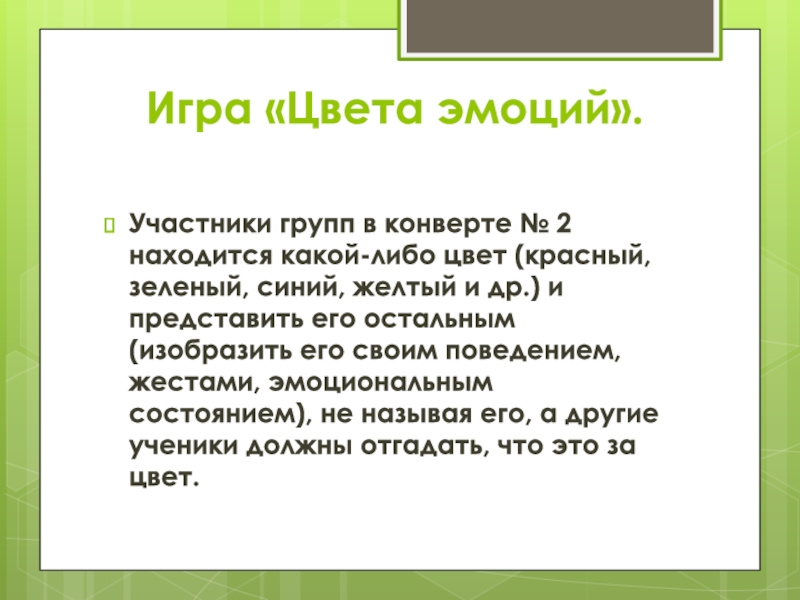 цвет (красный, зеленый, синий, желтый и др.) и представить его остальным (изобразить его своим поведением, жестами, эмоциональным состоянием), не называя его, а другие ученики должны отгадать, что это за цвет.