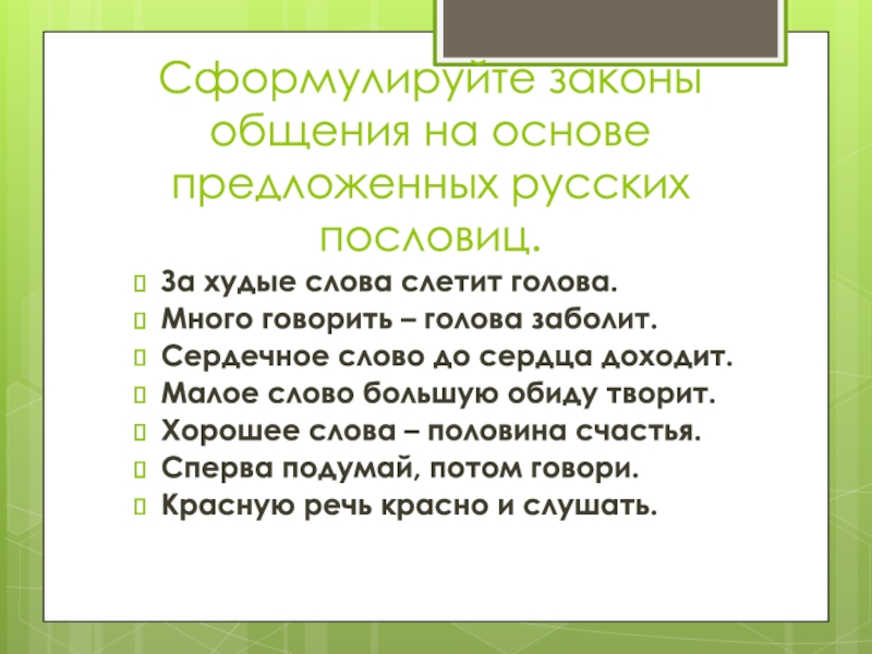 Слайд 15Сформулируйте законы общения на основе предложенных русских пословиц.