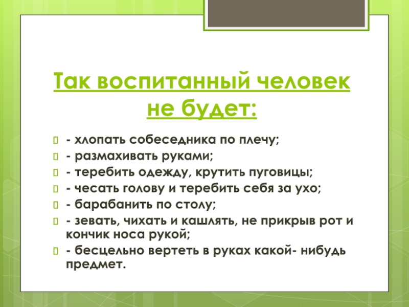- зевать, чихать и кашлять, не прикрыв рот и кончик носа рукой;