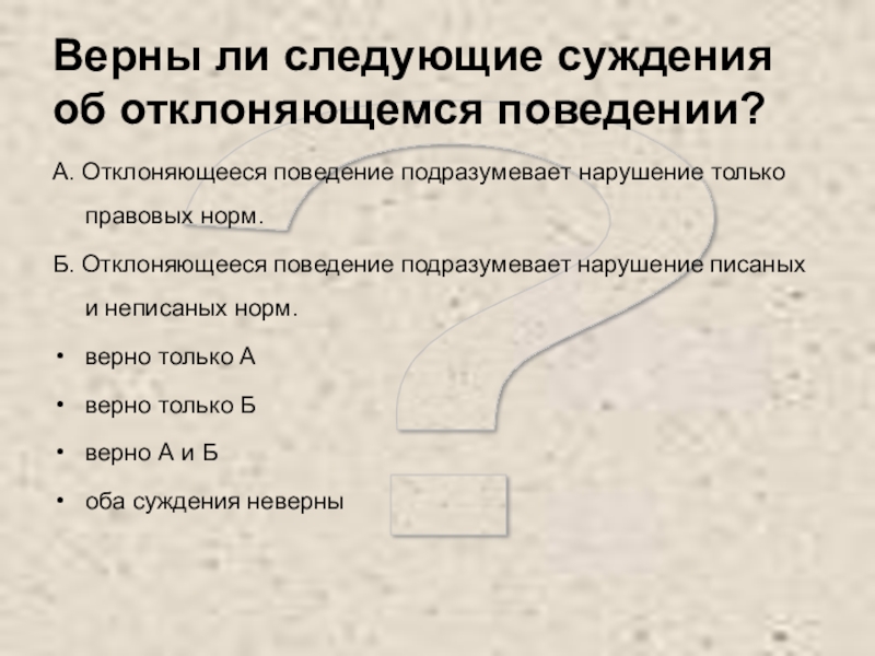 ?Верны ли следующие суждения об отклоняющемся поведении?А. Отклоняющееся поведение подразумевает нарушение только правовых норм.Б. Отклоняющееся поведение подразумевает