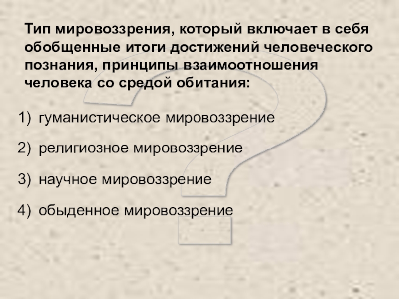 ?Тип мировоззрения, который включает в себя обобщенные итоги достижений человеческого познания, принципы взаимоотношения человека со средой обитания:гуманистическое