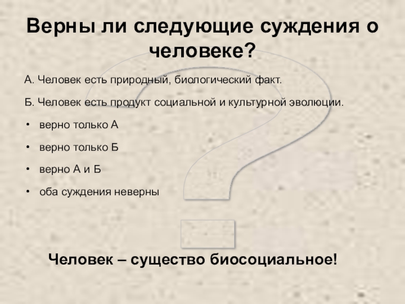 ?Верны ли следующие суждения о человеке?А. Человек есть природный, биологический факт.Б. Человек есть продукт социальной и культурной