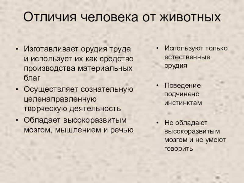 Отличия человека от животныхИзготавливает орудия труда и использует их как средство производства материальных благОсуществляет сознательную целенаправленную творческую