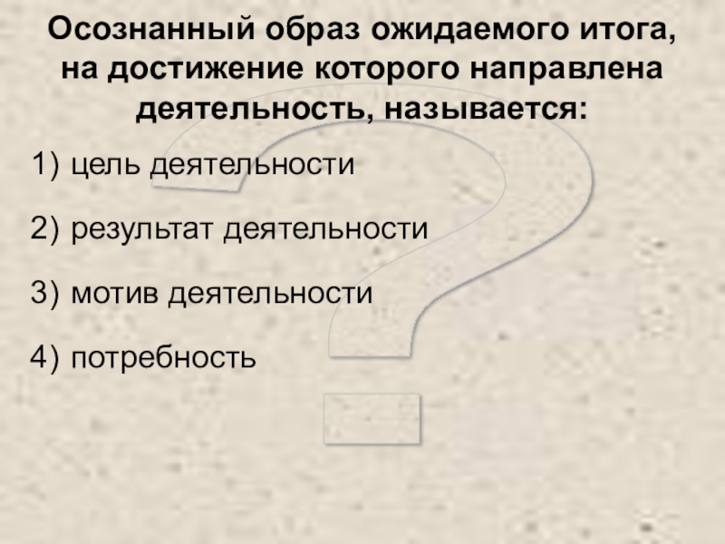 ?Осознанный образ ожидаемого итога, на достижение которого направлена деятельность, называется:цель деятельностирезультат деятельностимотив деятельностипотребность