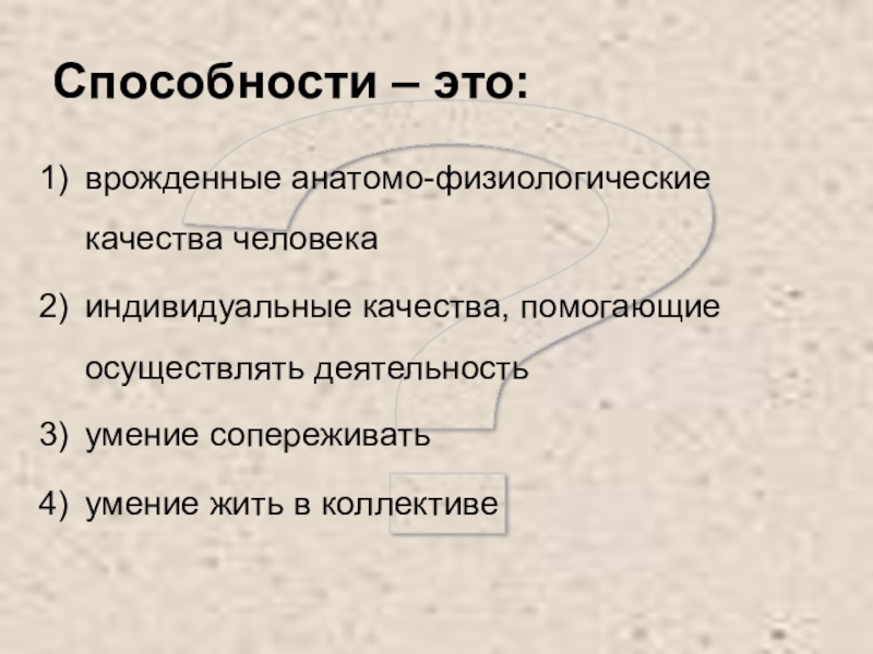 Задатки и способностиЗадатки – врожденные анатомо-физиологические особенности нервной системы.Способности – сформировавшиеся на основе задатков индивидуальные качества, которые