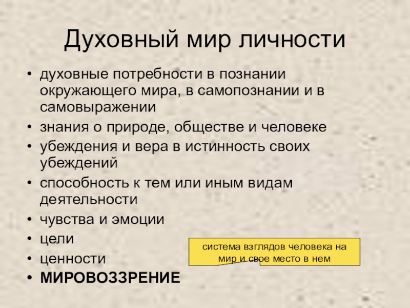 Духовный мир личностидуховные потребности в познании окружающего мира, в самопознании и в самовыражениизнания о природе, обществе и