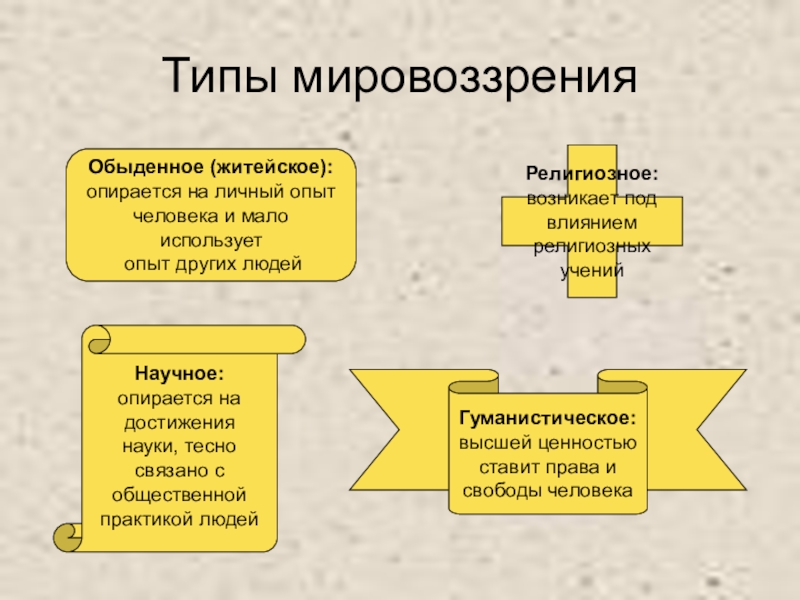 Типы мировоззренияОбыденное (житейское):опирается на личный опыт человека и мало использует опыт других людейРелигиозное: возникает под влиянием религиозных