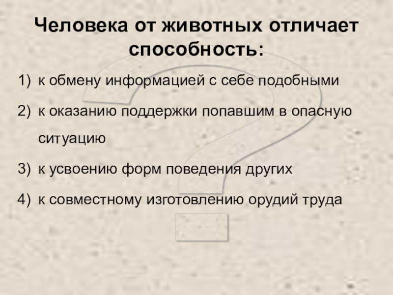 ?Человека от животных отличает способность:к обмену информацией с себе подобнымик оказанию поддержки попавшим в опасную ситуациюк усвоению
