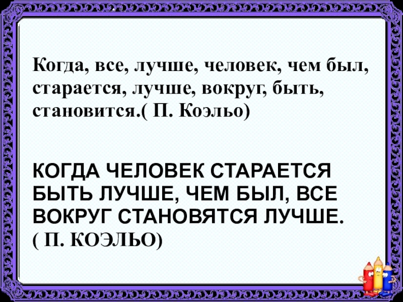 Когда, все, лучше, человек, чем был, старается, лучше, вокруг, быть, становится.( П. Коэльо)