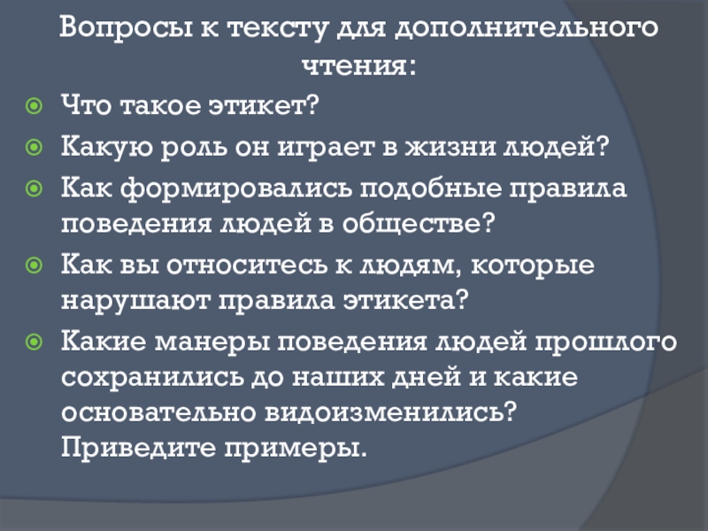 Вопросы к тексту для дополнительного чтения:Что такое этикет?Какую роль он играет в жизни людей?Как формировались подобные правила