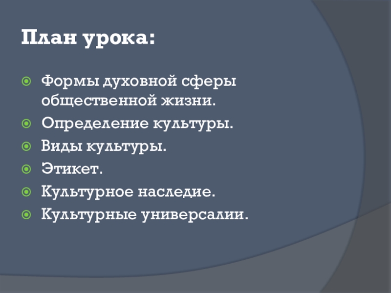 План урока:Формы духовной сферы общественной жизни.Определение культуры.Виды культуры.Этикет.Культурное наследие.Культурные универсалии.