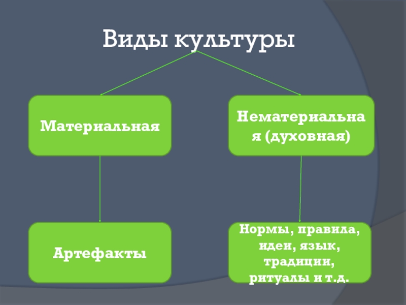 Виды культурыМатериальнаяНематериальная (духовная)АртефактыНормы, правила, идеи, язык, традиции, ритуалы и т.д.