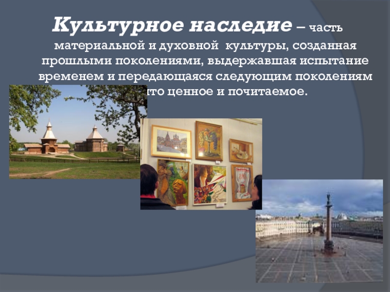 Культурное наследие – часть материальной и духовной культуры, созданная прошлыми поколениями, выдержавшая испытание временем и передающаяся следующим