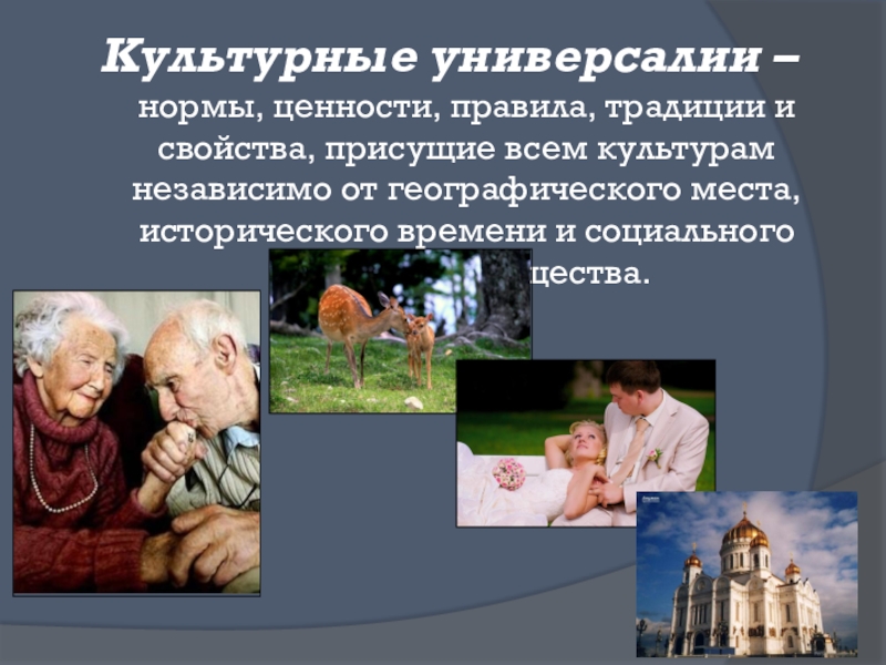 Культурные универсалии – нормы, ценности, правила, традиции и свойства, присущие всем культурам независимо от географического места, исторического