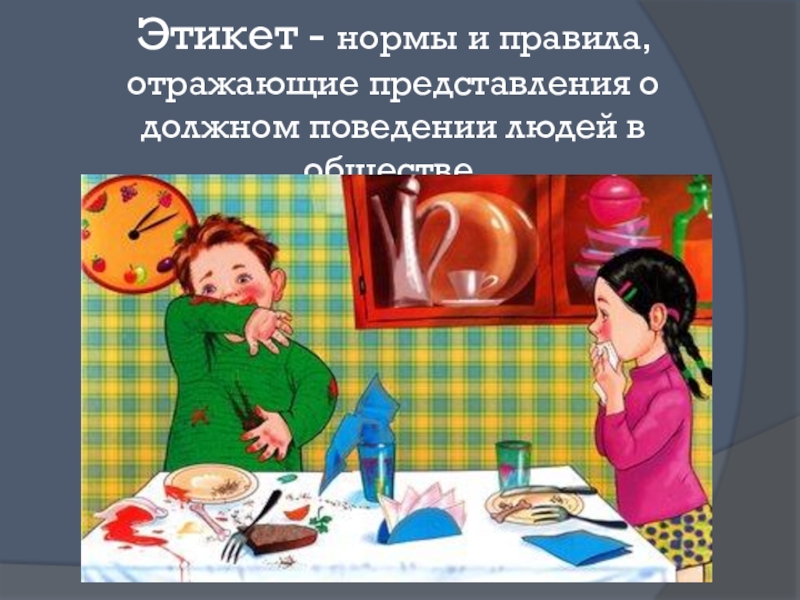 Слайд 12Этикет - нормы и правила, отражающие представления о должном поведении людей