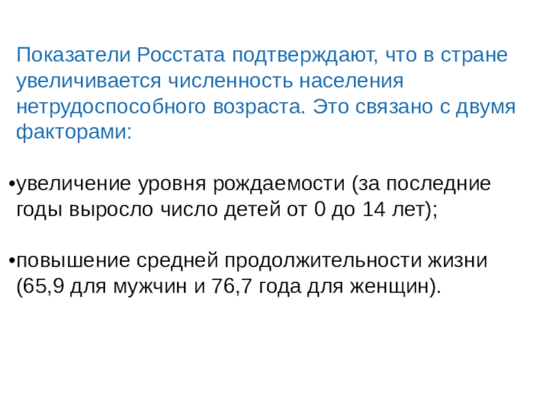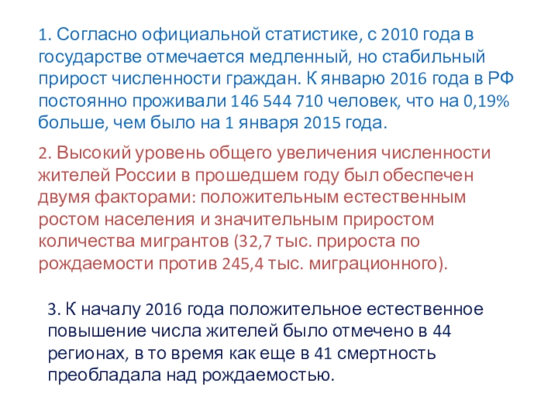 2. Высокий уровень общего увеличения численности жителей России в прошедшем году был обеспечен двумя факторами: положительным естественным ростом населения и значительным приростом количества мигрантов (32,7 тыс. прироста по рождаемости против 245,4 тыс. миграционного).