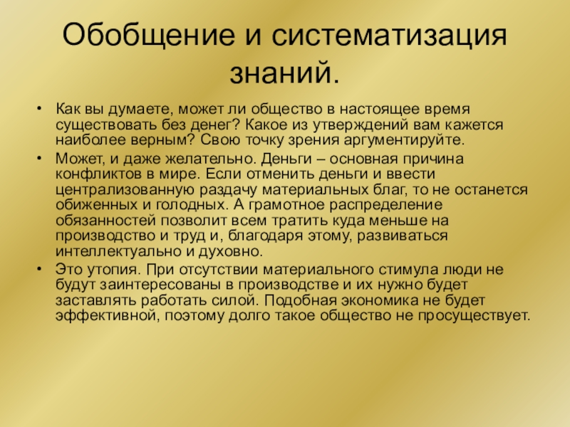 время существовать без денег? Какое из утверждений вам кажется наиболее верным? Свою точку зрения аргументируйте.