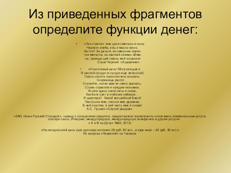 Слайд 4Из приведенных фрагментов определите функции денег: