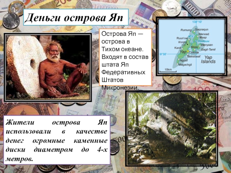 Жители острова Яп использовали в качестве денег огромные каменные диски диаметром до 4-х метров.