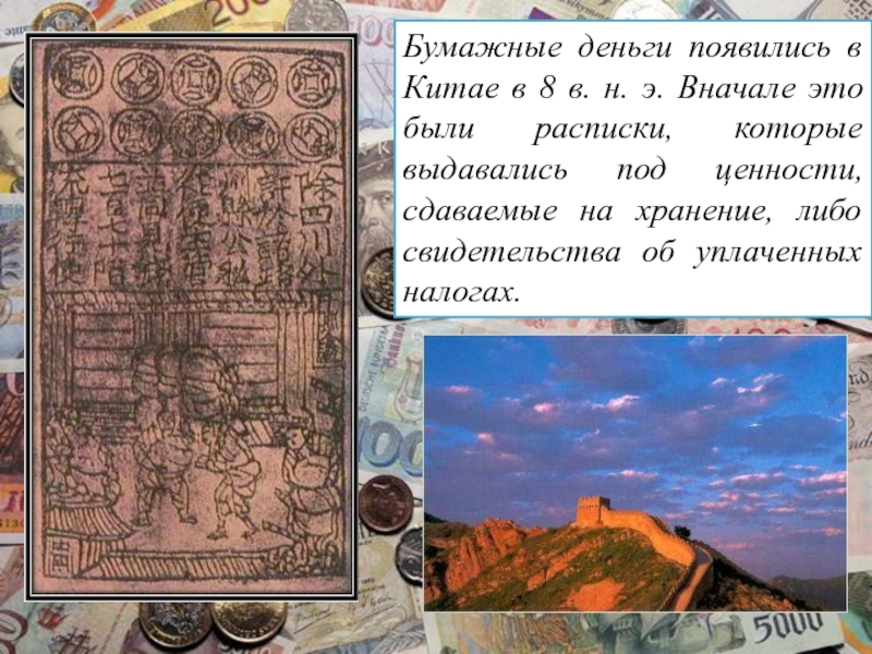 Слайд 5Бумажные деньги появились в Китае в 8 в. н. э. Вначале