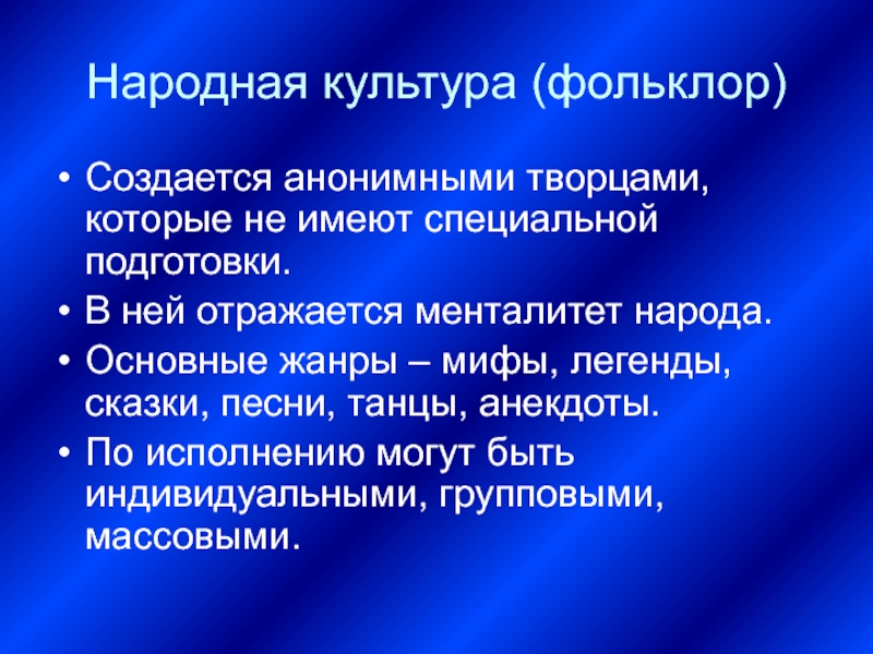 Основные жанры – мифы, легенды, сказки, песни, танцы, анекдоты.