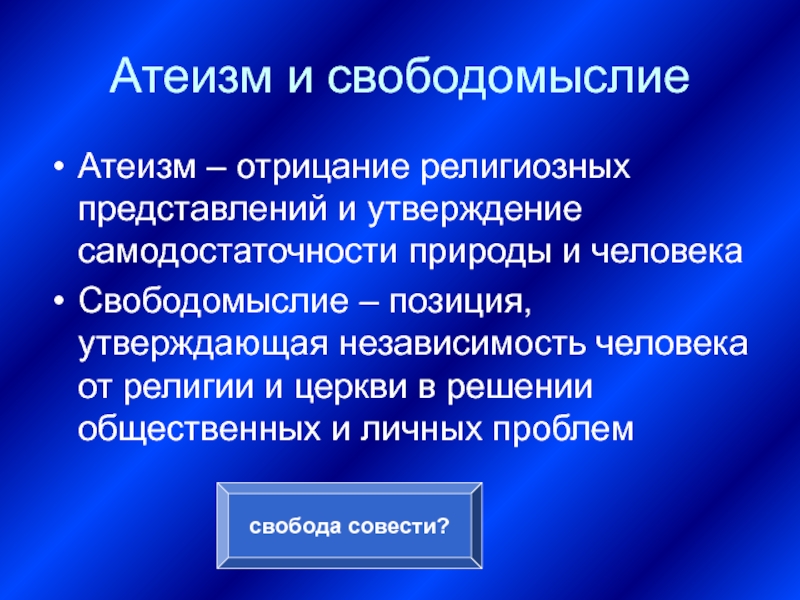 Свободомыслие – позиция, утверждающая независимость человека от религии и церкви в решении общественных и личных проблем