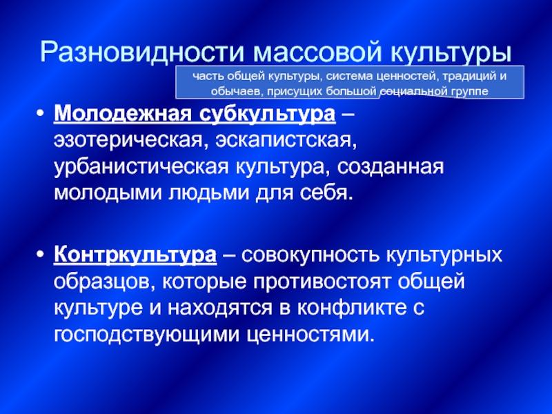 Молодежная субкультура – эзотерическая, эскапистская, урбанистическая культура, созданная молодыми