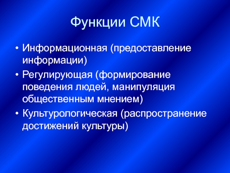 Регулирующая (формирование поведения людей, манипуляция общественным мнением)