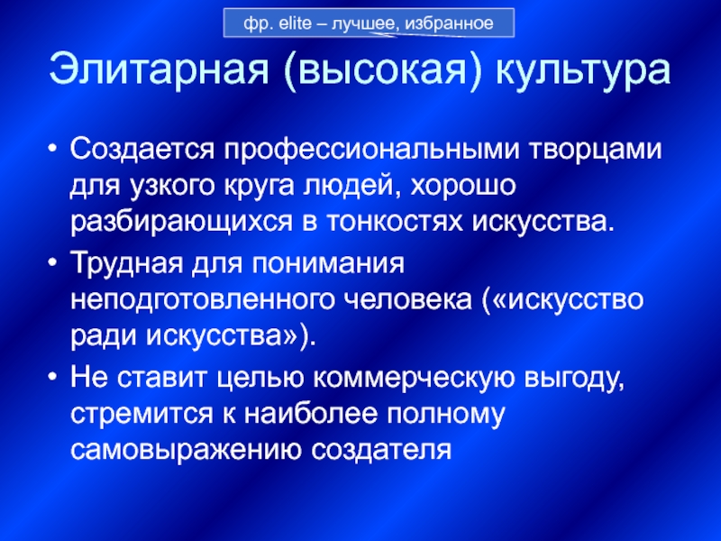 Создается профессиональными творцами для узкого круга людей, хорошо разбирающихся